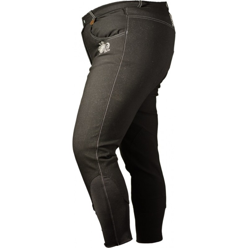 Materialet är väldigt likt Jean Genie men detta ser inte ut som en jeansridbyxa. Superstretchiga, lite höga i midjan men inte så höga som ex. Sticky Vicki. Lycrabenslut för högsta komfort under stövlar eller shortchaps. Fuller Fillies standardbenlängd som är aningens kortare än de flesta andra fabrikat. Innerbenlängden är 73,7 cm.